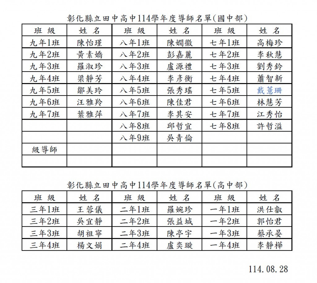 彰化縣立田中高級中學114學年度國高中部導師名單-更新