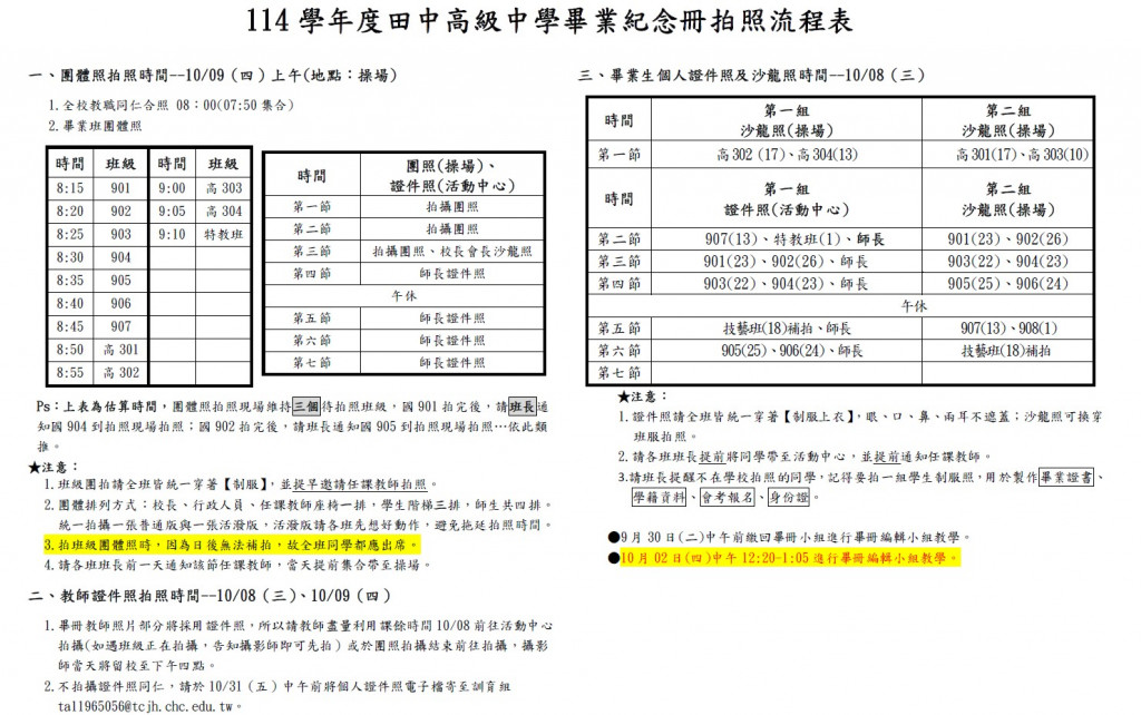 114學年度國三.高三及師長證件照.團體照.沙龍照.拍照流程表(畢冊編輯會議改為10/2中午)