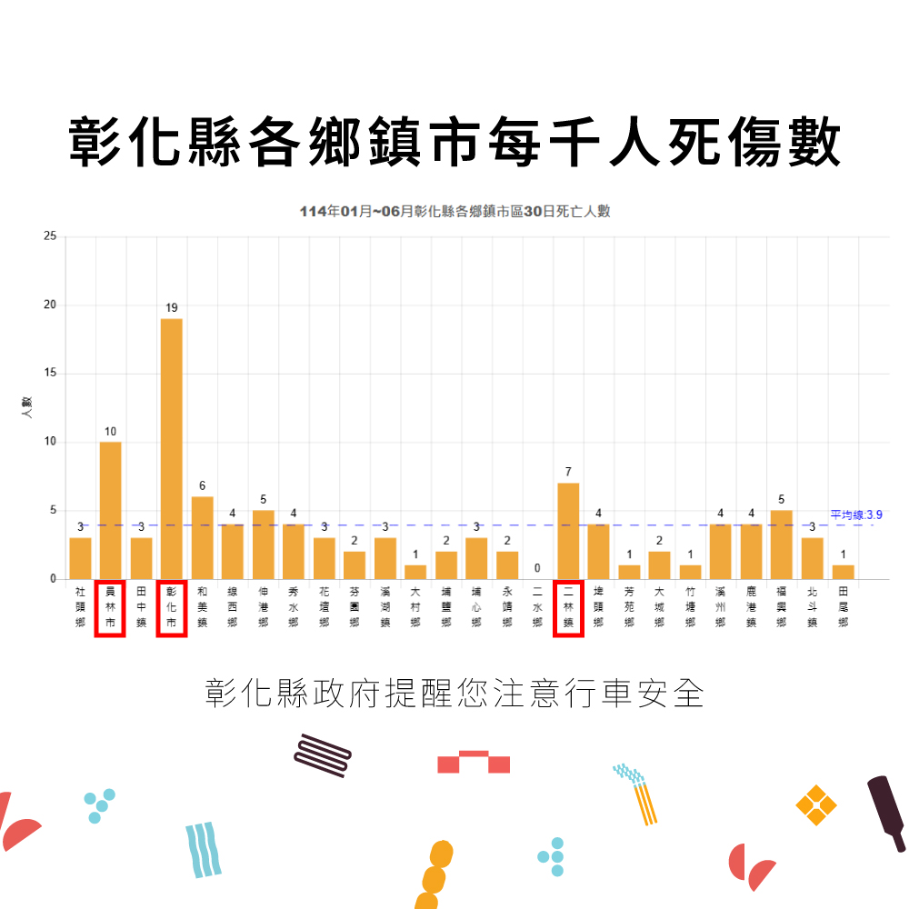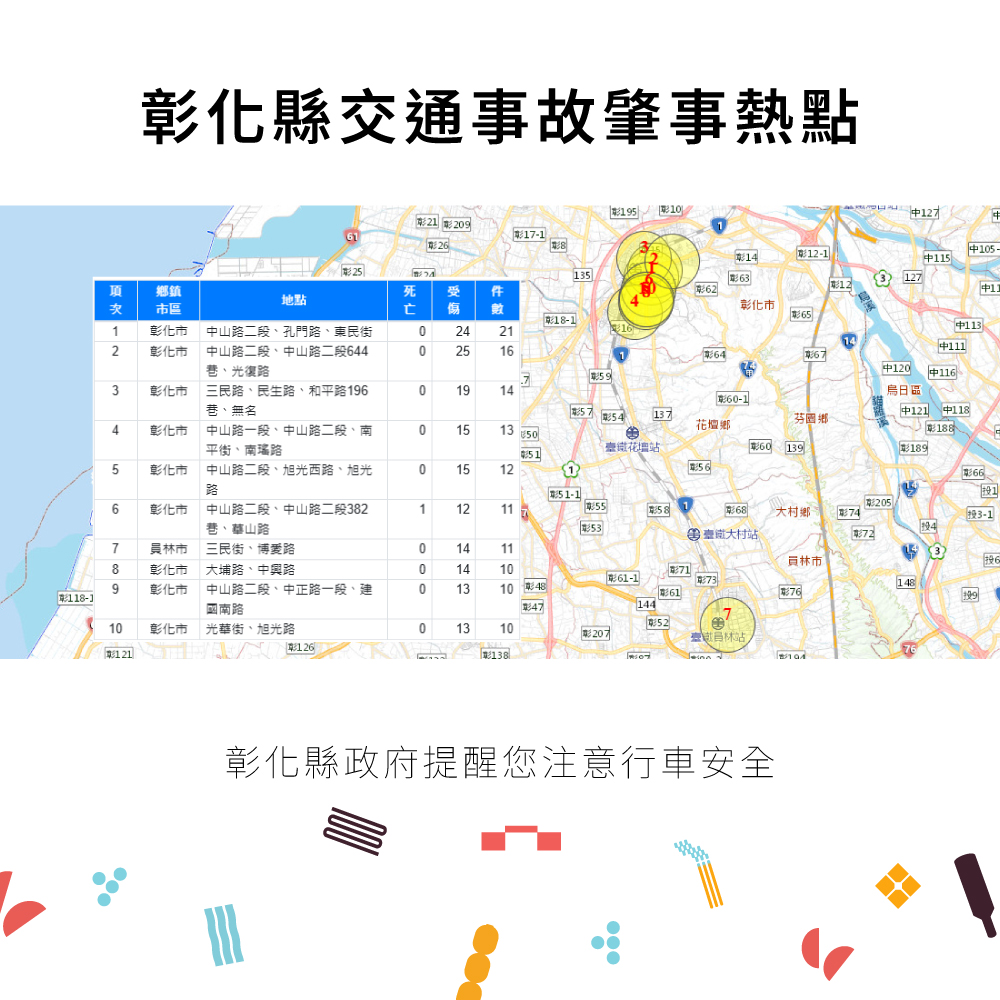 五、附件為「114年1-6月全國道路交通事故統計、彰化縣交通事故總覽、本縣各鄉鎮市每千人死傷人數及肇事熱點」共4份統計資料宣導圖,社群宣導內容可參閱或分享本處「花現彰化-2025台灣設計展」(https://reurl.cc/mYjXKA)臉書粉絲專頁。