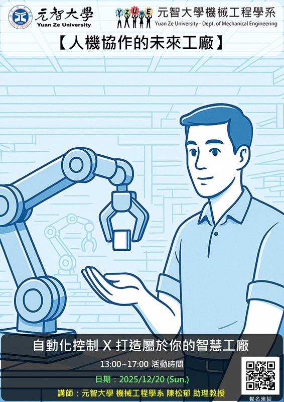 轉知:元智大學機械工程學系於114年12月20日(週六)舉辦「自動化控制 X 打造屬於你的智慧工廠」營隊教學活動