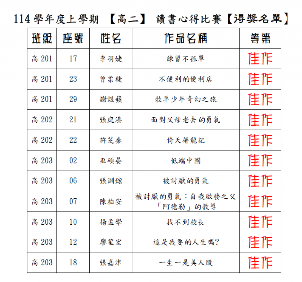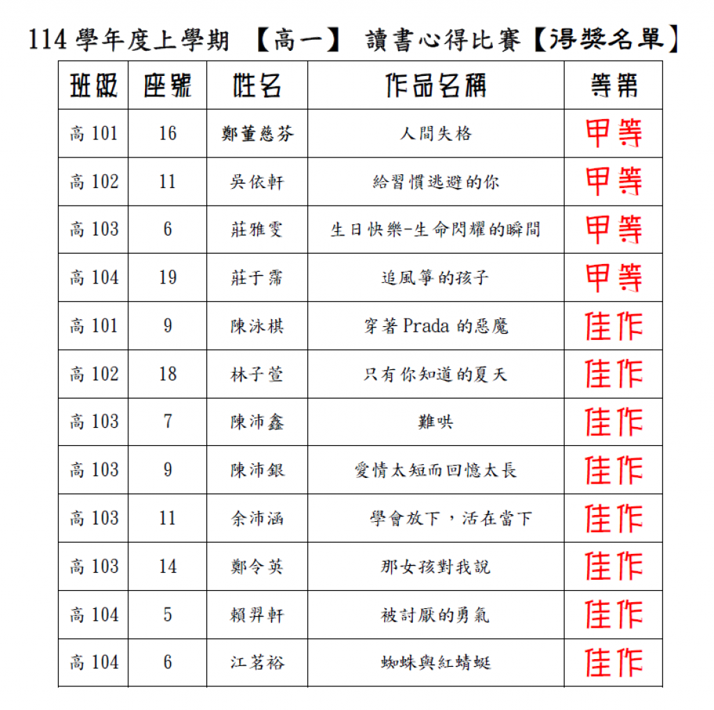 114(1)高一高二閱讀心得寫作比賽得獎名單