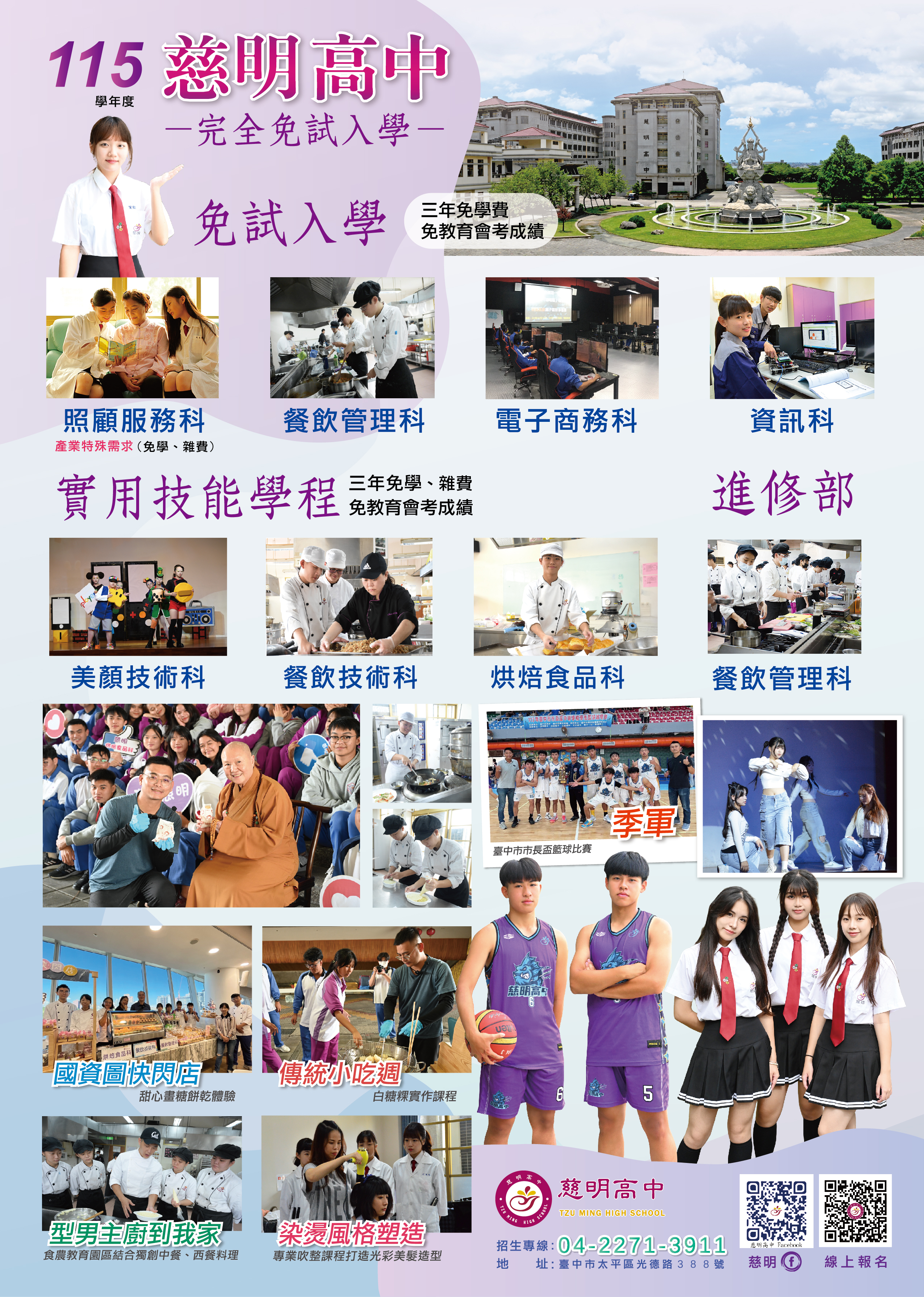 一、本校建教合作班開辦6年,感謝支持,114學年度計有地區內102所國中畢業生就讀。 二、115學年度開設「餐飲管理科」、「觀光事業科」、「美容科」輪調式建教合作班;另「餐飲管理科」開設第3年王品專班。 三、就讀本班可兼顧工作與學業,凡符合產攜2.0計畫資格,在校學習期間綜合表現優異,每月可領取5仟元補助,可讓弱勢學生自力完成學業,減輕各方負擔。