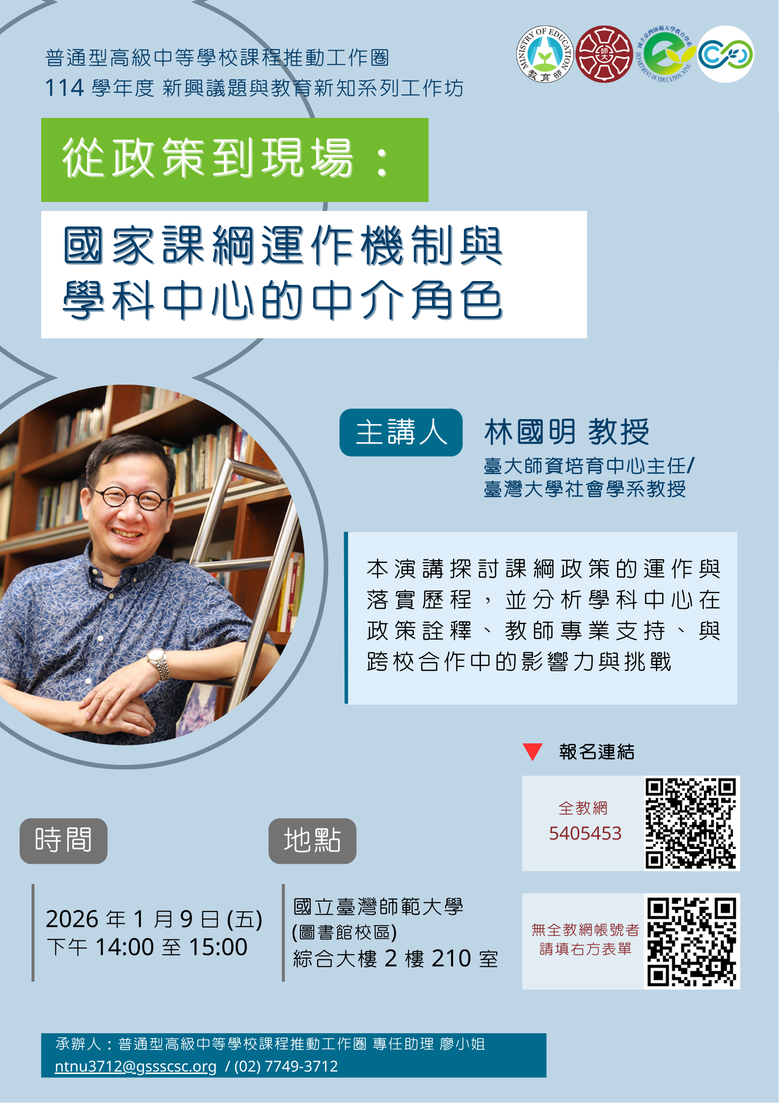 邀請來自國立臺灣大學師資培育中心主任林國明教授,探討課綱政策的落實歷程,