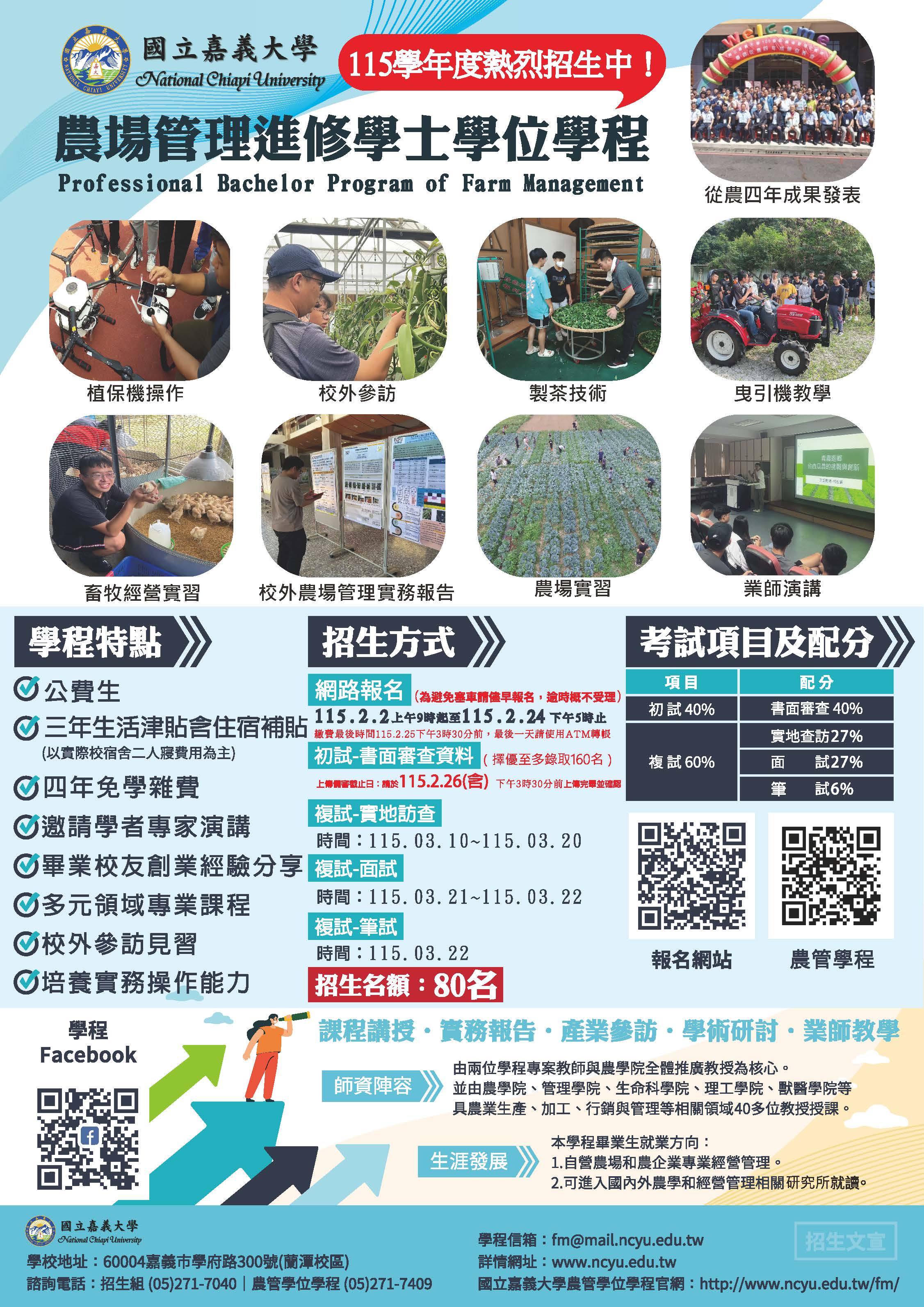 國立嘉義大學農場管理進修學士學位學程115學年度農業公費專班招生簡章及海報,敬請惠予公告,並鼓勵貴校學生踴躍報考,請查照。