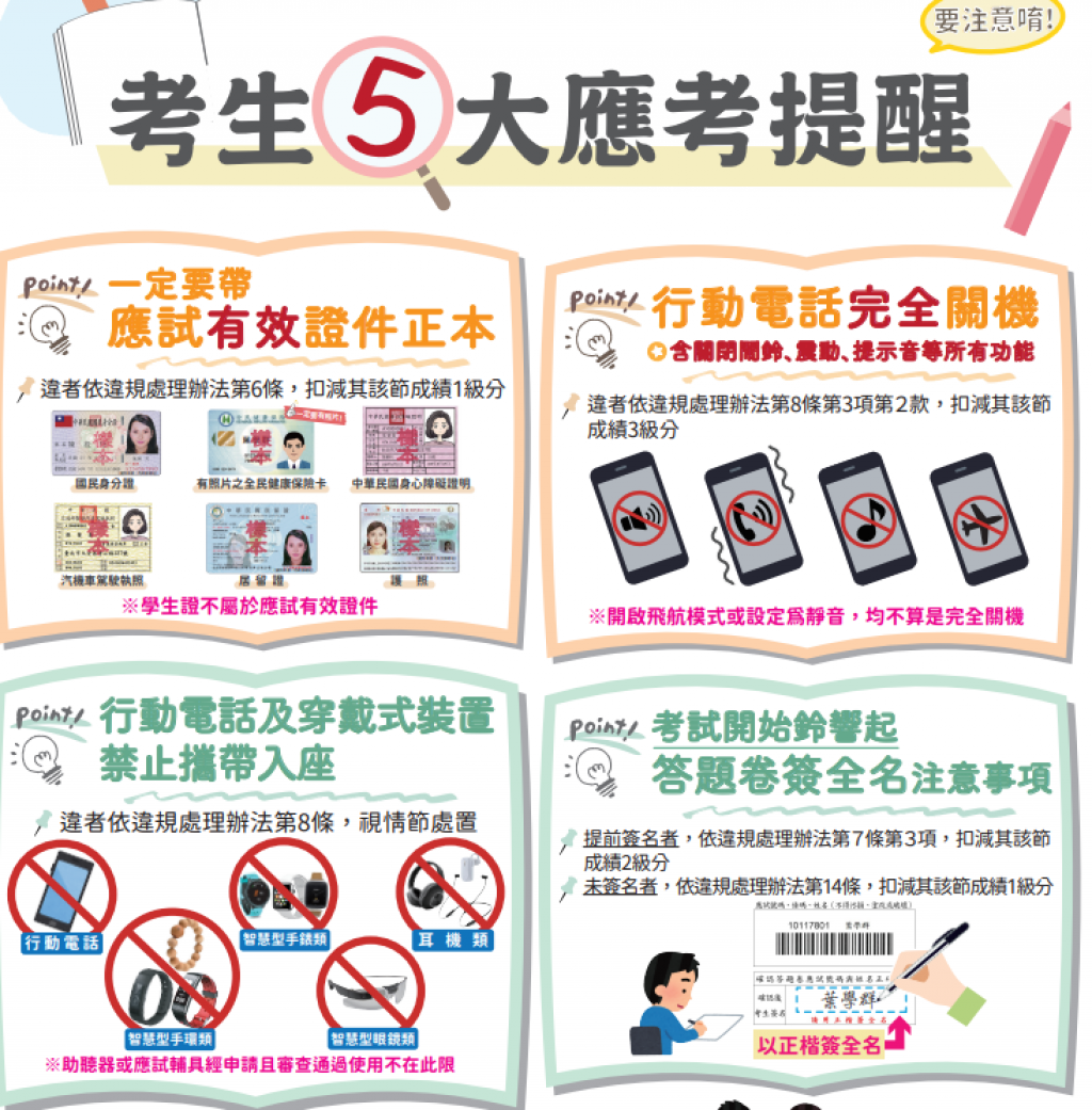 - 請注意高三考生進入校園務必遵守考場規範,切勿大聲喧嘩,破壞考場布置,了解考場狀況後請盡速回家,休息、放鬆做好萬全準備,才能面對挑戰。