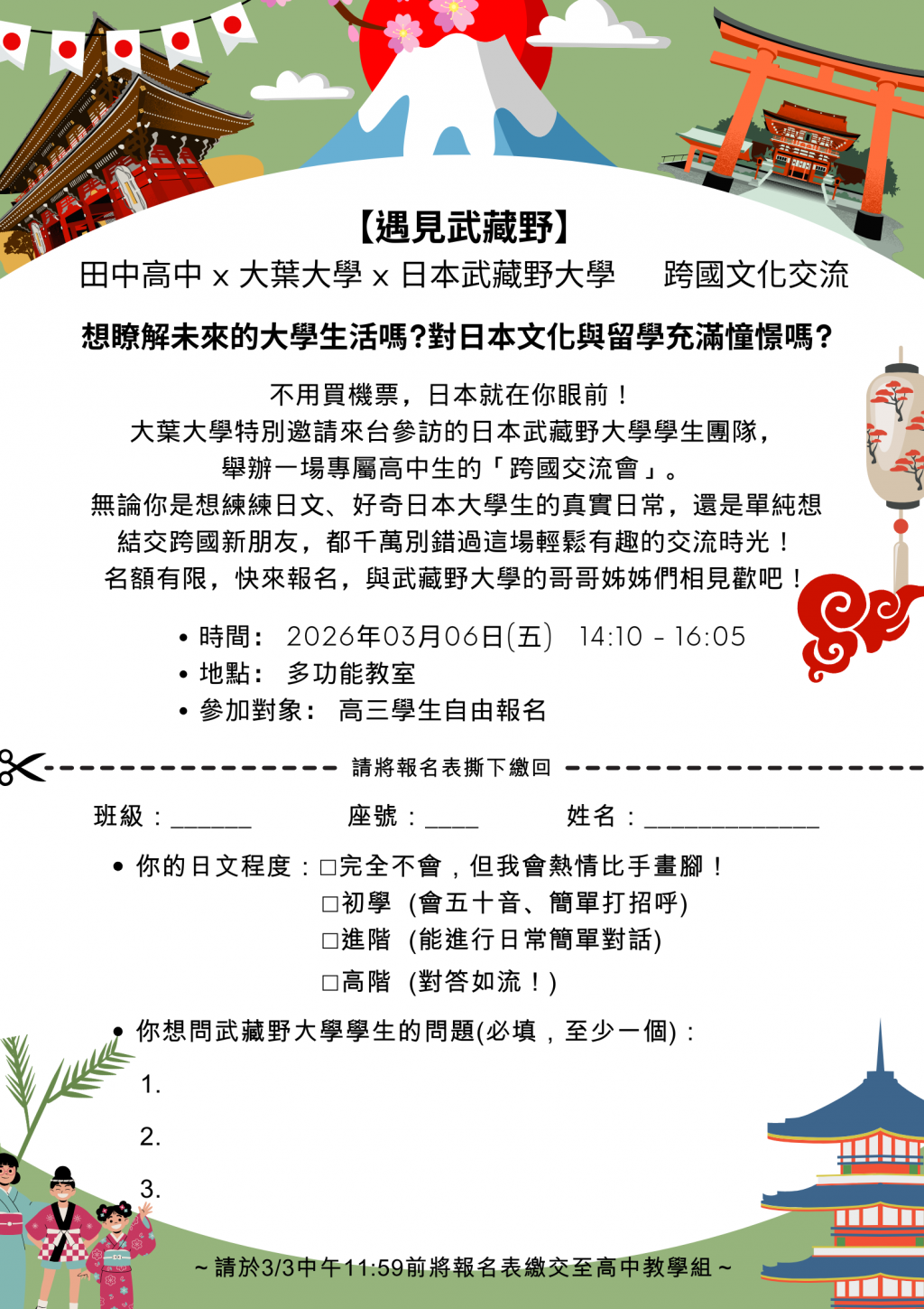 想瞭解未來的⼤學⽣活嗎?對⽇本⽂化與留學充滿憧憬嗎? 不⽤買機票,⽇本就在你眼前! ⼤葉⼤學特別邀請來台參訪的⽇本武藏野⼤學學⽣團隊, 舉辦⼀場專屬⾼中⽣的「跨國交流會」。 無論你是想練練⽇⽂、好奇⽇本⼤學⽣的真實⽇常,還是單純想 結交跨國新朋友, 都千萬別錯過這場輕鬆有趣的交流時光! 名額有限,快來報名,與武藏野⼤學的哥哥姊姊們相⾒歡吧!