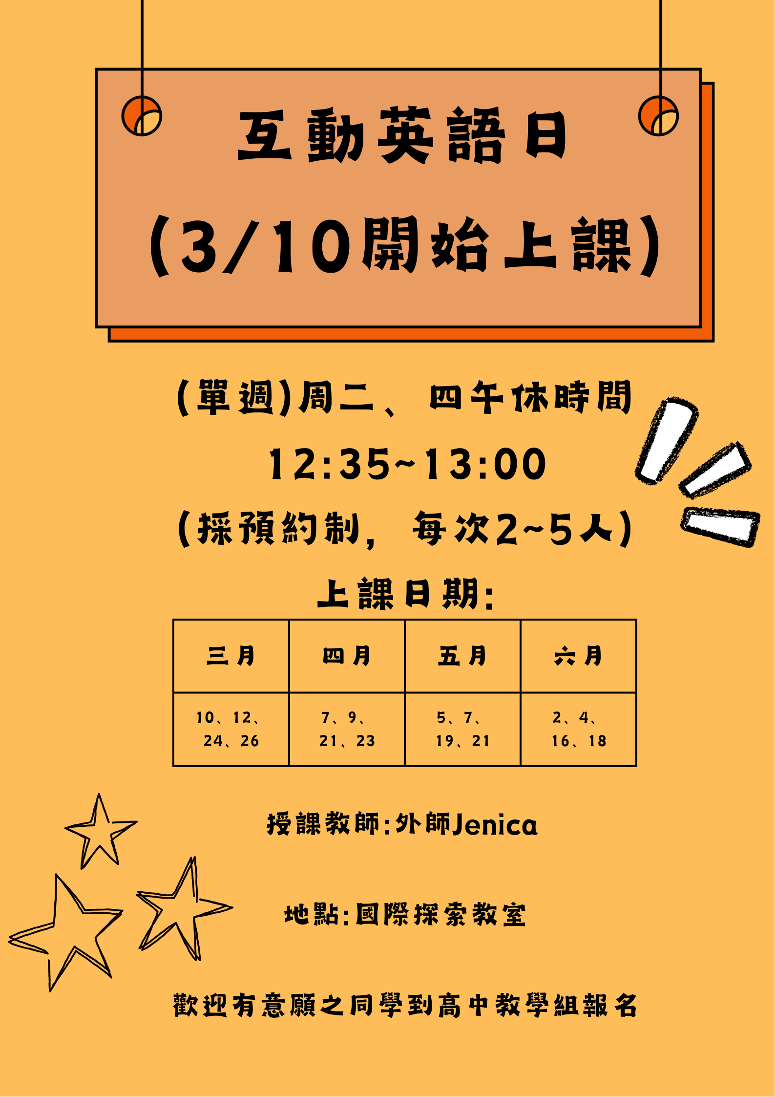 外師Jenica與你面對面練習口說英語 每次只有2~5人,有興趣的同學請提早預約報名喔! 即日起開放高中部與國中部學生報名參加,詳細活動日期請參閱附件資料, 於上課日期前三天到教務處高中教學組報名(可一次預約單次或多次課程)。