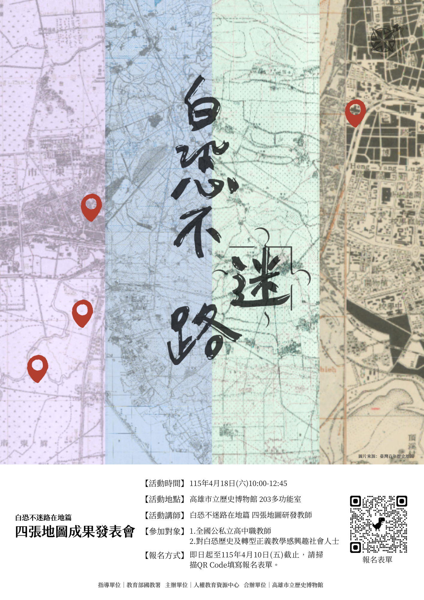 二、為推廣轉型正義教育,本中心歷時兩年研發台北、雲林、高雄及屏東四張「白恐不迷路在地篇」地圖教材,
