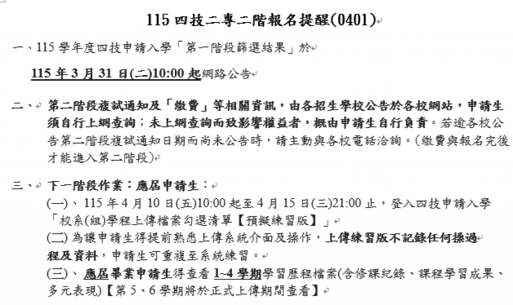 一、115學年度四技申請入學「第一階段篩選結果」於
