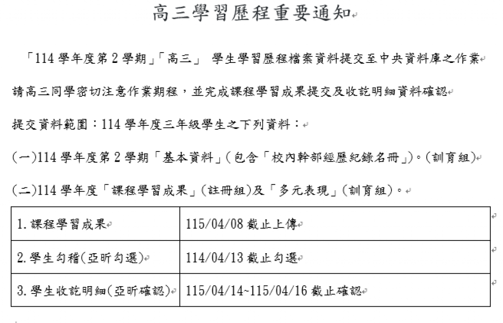 請高三同學密切注意作業期程,並完成課程學習成果提交及收訖明細資料確認