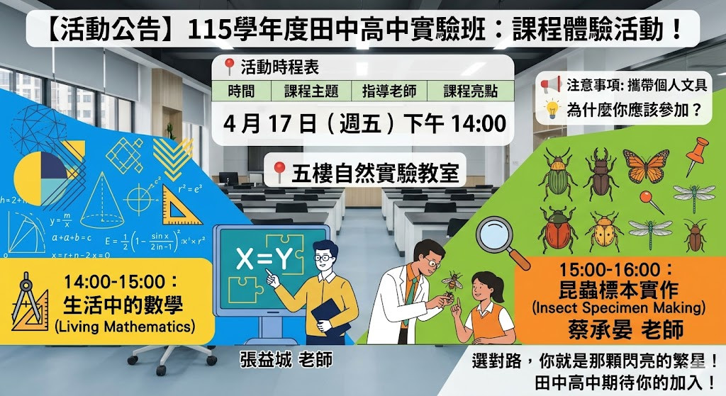 想搶先體驗田中高中實驗班的魅力嗎?我們特別在 4 月 17 日 安排了兩場超精彩的深度體驗課程,邀請你一起動手做、動腦想,感受不一樣的高中學習風景!