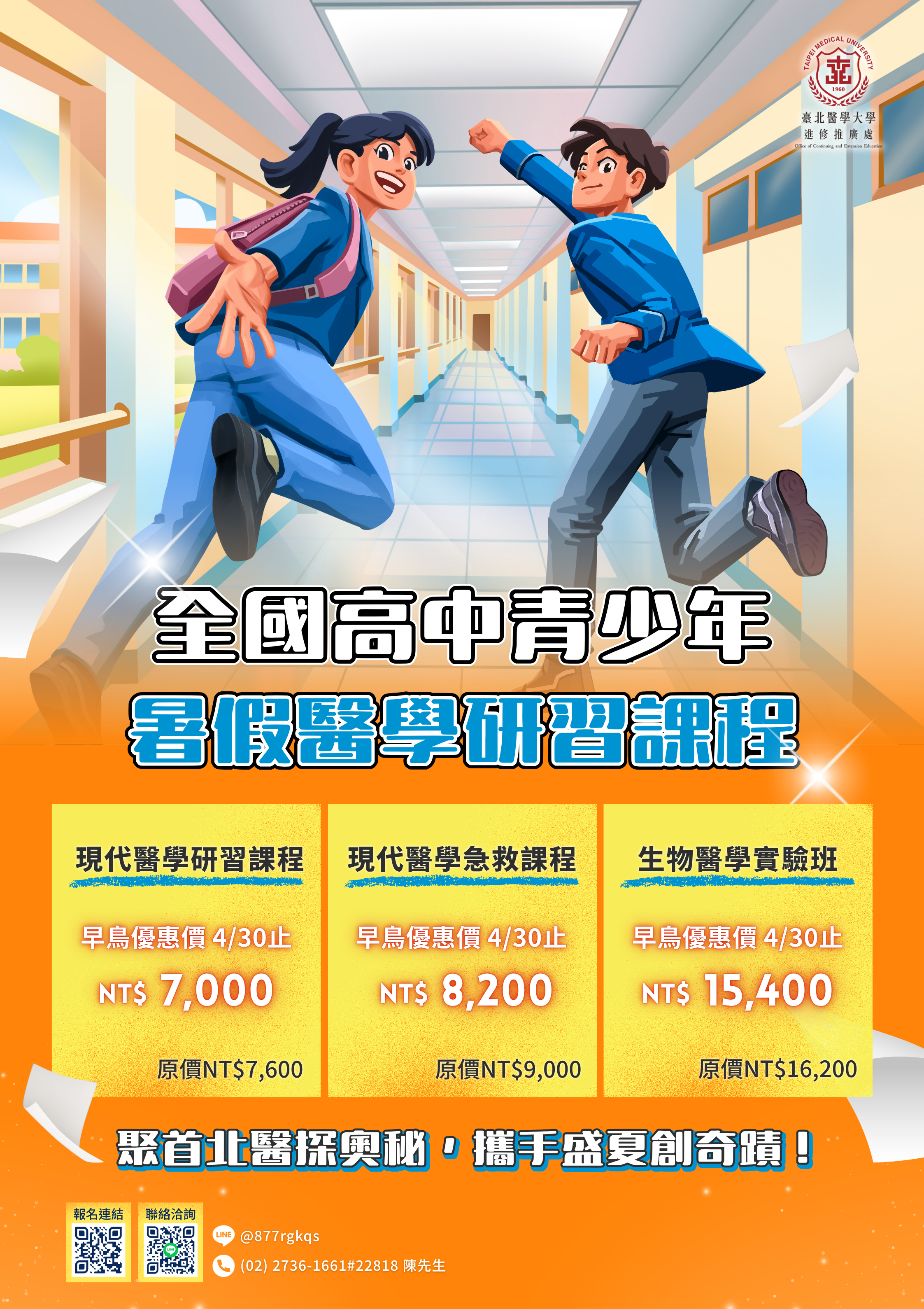 臺北醫學大學為鼓勵高中學子於暑假期間參與多元學習,訂於115年7月1日至8月30日辦理【全國青少年高中暑假研習】系列課程。由各學系優秀大學生全程陪伴,透過經驗分享與互動交流,引導學員認識大學生活並啟發學習方向;並藉由課程規劃,協助學員於探索與實作中建立目標、拓展視野。