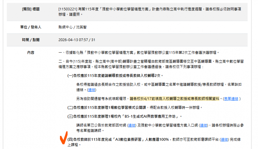 由於縣網數辦告知,今年各校參加A3研習老師比例需達到100%,麻煩國高中仍未參加過之教師同仁撥空於年底前,至校網首頁教師區-->edu磨課師+,完成"A3數位素養"增能研習,取得證書後,再以彰化縣G-Suite帳號登入,填寫Google表單上傳證書以便統計o